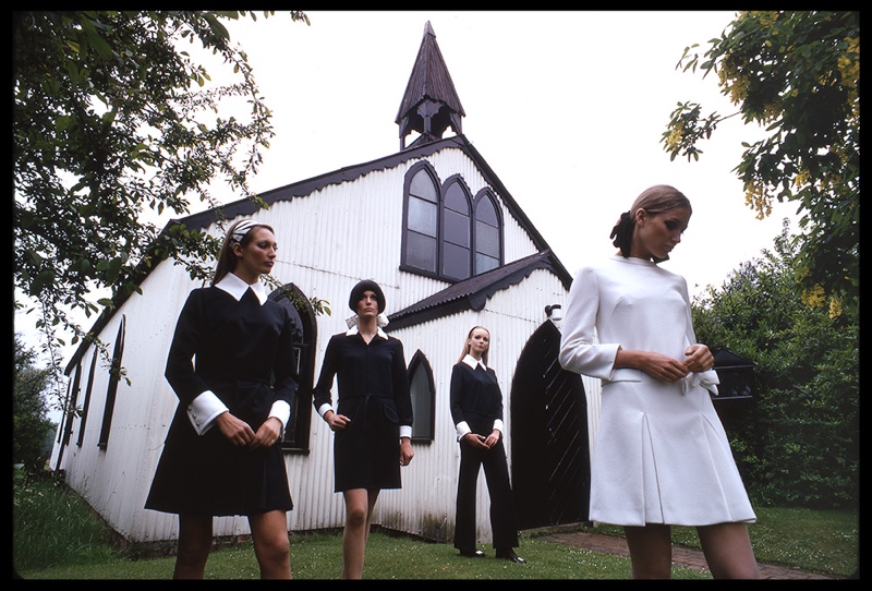 Fashion photo of models outside a church, for Alexon, 1960s. Photo Duffy © Duffy Archive